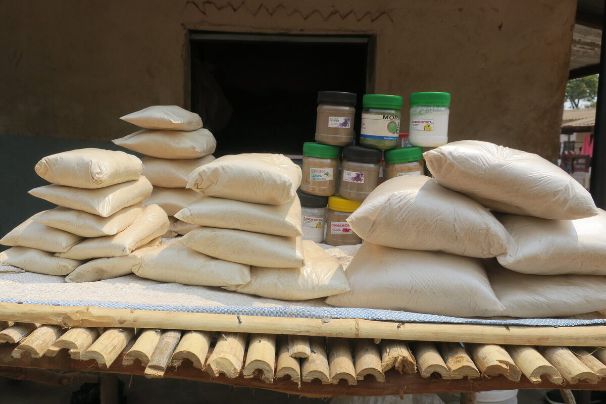 To make the porridge flour, Goundance uses locally grown products as ingredients. She mixes Soya Beans flour, Sorghum flour, Groundnut flour, Wheat flour, Millet flour and sometimes Maize mealie meal. All these products are grown by the local farmers in Meheba refugee settlement.